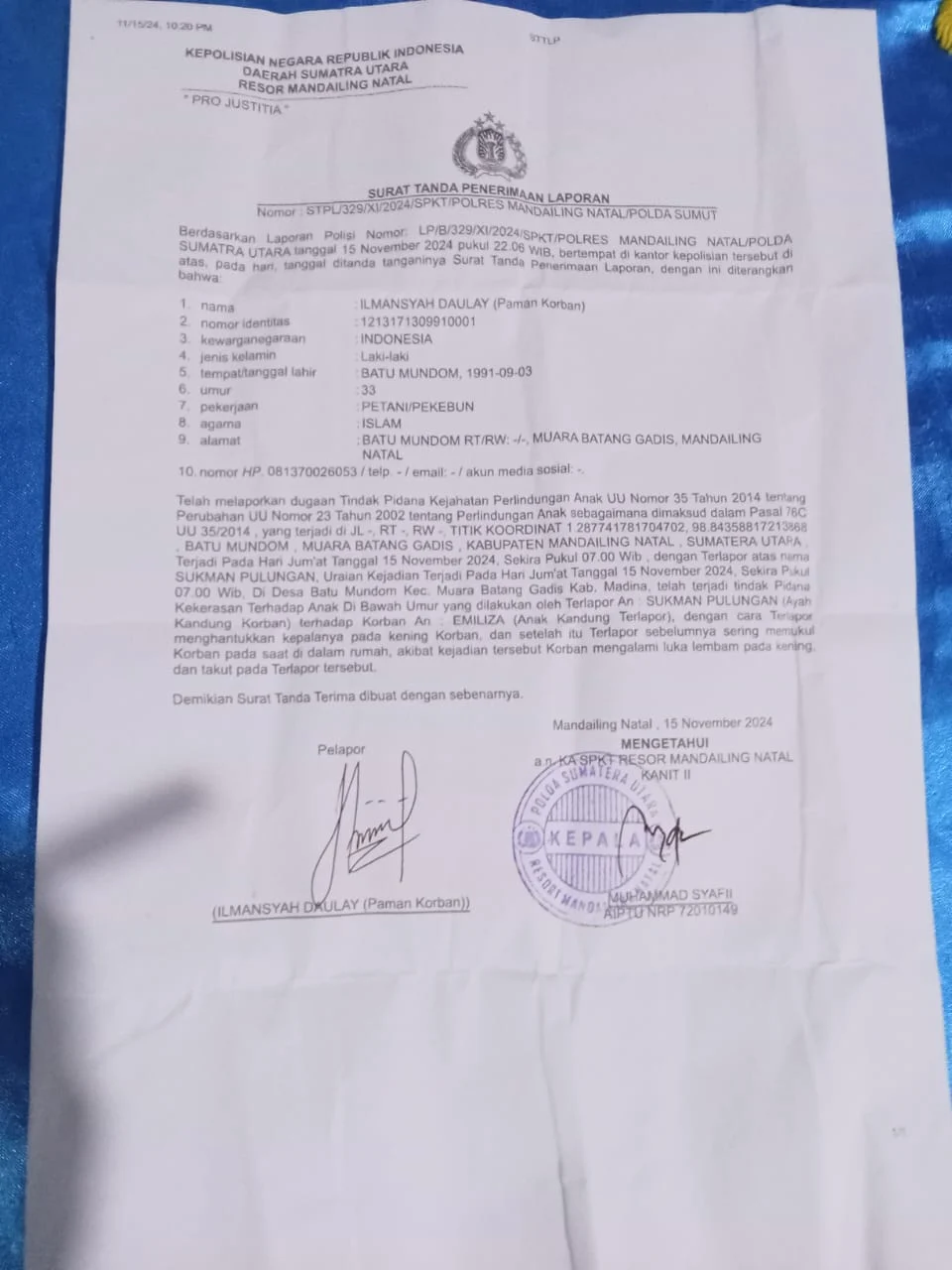 Berdasarkan laporan polisi nomor LP/B/329/XI/2024/SPKT/Polres Mandailing Natal, Polda Sumut, Tgl 15 November 2024 pukul 22.06 Wib Bertempat di kantor kepolisian tersebut di atas pada hari tanggal di tanda tanganinya surat tanda penerimaan laporan dengan ini di terangkan bahwa,