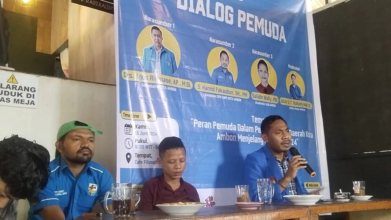 Investigasimaluku.com-Ambon.Dewan Pimpinan Daerah Komite Nasional Pemuda Indonesia (DPD KNPI) Kota Ambon, menggelar Dialog Pemuda dengan tema “Peran Pemuda Dalam Pembangunan Daerah Kota Ambon Menjelang Pilkada 2024”,pada hari jumat tanggal 14 Juni 2024 di Caffe Filosofi.