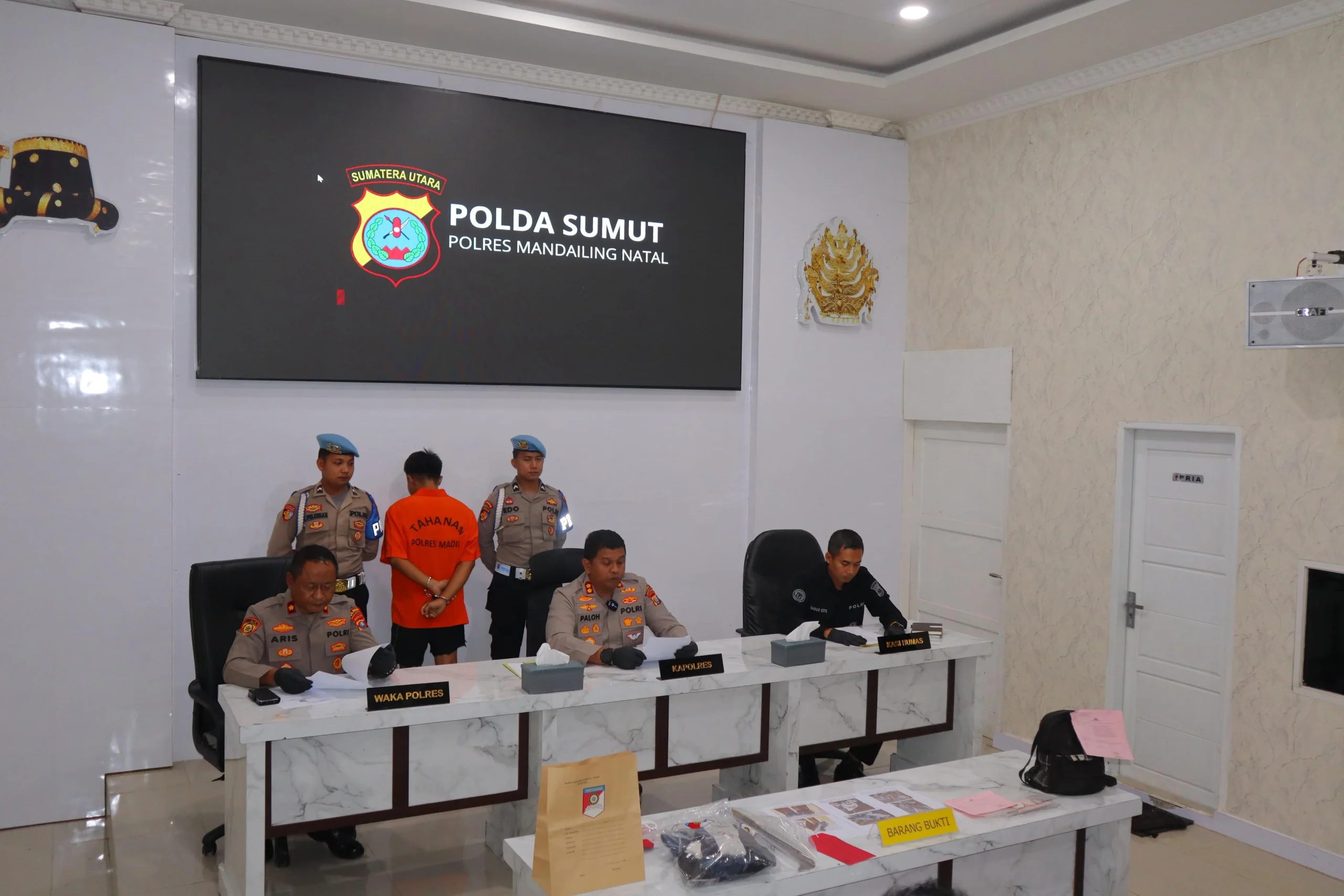 Kapolres Madina memberikan pemaparan kasus pembunuhan remaja bernama DF (15) yang dilakukan oleh Yunus Saputra (22) di Desa Taluk, Kecamatan Natal. Kapolres mengatakan, motif peristiwa itu adalah perampokan dengan kekerasan. Yunus ingin menguasai harta korban seperti sepeda motor, handphone, dan uang tunai Rp250 ribu milik korban.