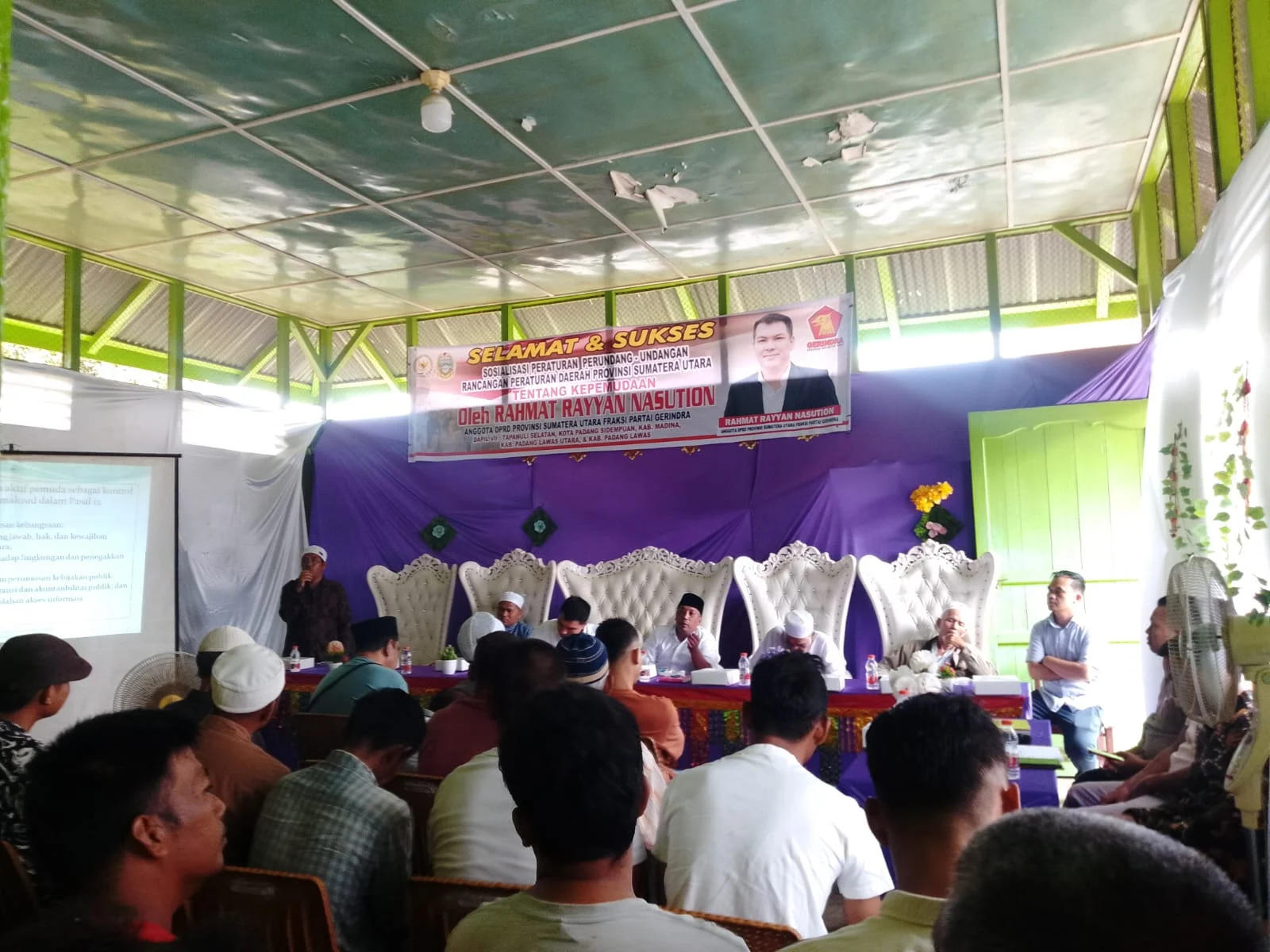 Ahmad Rayyan Nasution, Anggota DPRD Provinsi Sumut dari Fraksi Gerindra Dapil VII ( Komisi D)Tapanuli Bagian Selatan melaksanakan Sosialisasi Peraturan Perundang-undangan Rancangan peraturan Daerah Provinsi Sumatera Utara Tentang Kepemudaan di desa Roburan Lombang,
