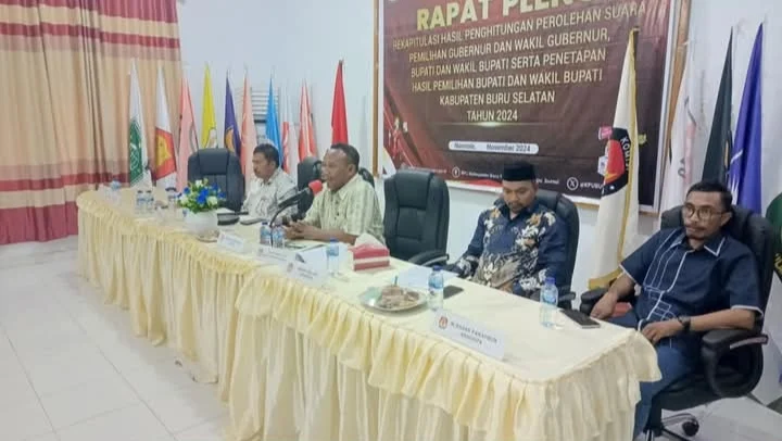 Namrole,-mediainvestigasimaluku.com //Komisi Pemilihan Umum (KPU) Kabupaten Buru Selatan melaksanakan Rapat Pleno dalam rangka Rekapitulasi Hasil Penghitungan Perolehan Suara Pemilihan Gubernur dan Wakil Gubernur, Bupati dan Wakil Bupati serta Penetapan Hasil Pemilihan Bupati dan Wakil Bupati Kabupaten Buru Selatan Tahun 2024 (Senin, 02/11/2024).